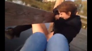 湖のほとりの桟橋に座る女性。お尻丸出しの状態で柵に寄りかかった状態で、放尿しちゃってます。 ...
